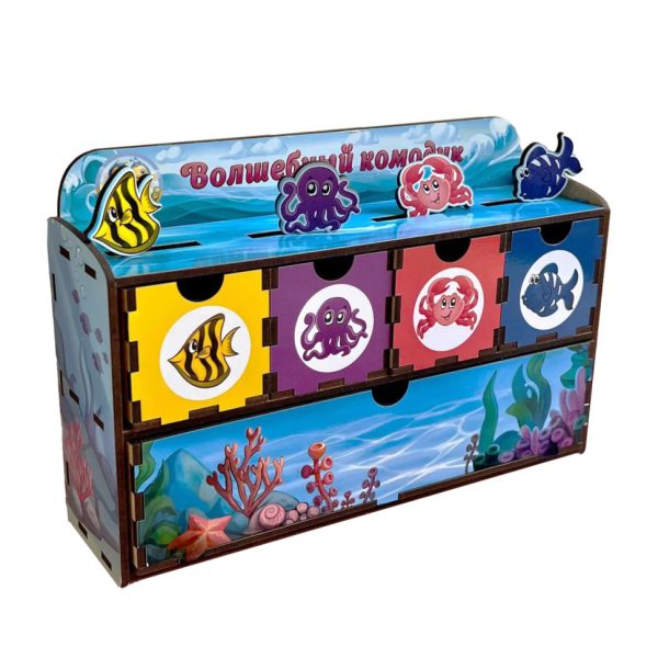 Комод складається з 4 тематичних шухлядок для сортування вкладишів за кольором, малюнком і 1 шухлядки, де знаходяться планки для вкладання. У наборі 6 планок і 30 фігур морських мешканців для сортування.