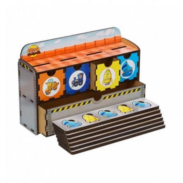 Комод складається з 4 тематичних шухлядок для сортування вкладишів за кольором, малюнком і 1 шухлядки, де знаходяться планки для вкладання. У наборі 6 планок і 30 фігур транспорту для сортування.