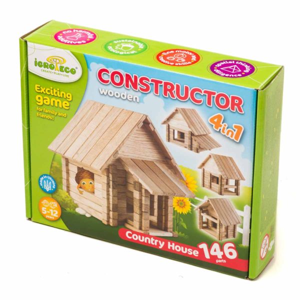 Конструктор «Заміський будиночок 4 в 1» призначений для діток від 5-ти до 12-ти років. З набору 146 деталей по інструкції почергово можна збудувати 4 компактні і дуже затишні будиночки з дверима та вікнами, різними типами прибудов та вхідних конструкцій. І це лише початок! Навчившись складати по інструкції, зрозумівши принцип побудови паз-в-паз, дитина зможе конструювати фантастичні фігури та об’єкти на власний смак та розсуд.Робота з конструктором дасть дитині розуміння основ будівництва помешкань зі зрубу – аутентичному українському методу зведення хат у Карпатах. Бруси та півбруси мають пази для скріплення між собою. Січення брусів – квадратне. Найкоротша деталь – 24 мм. Найдовша – 180 мм.