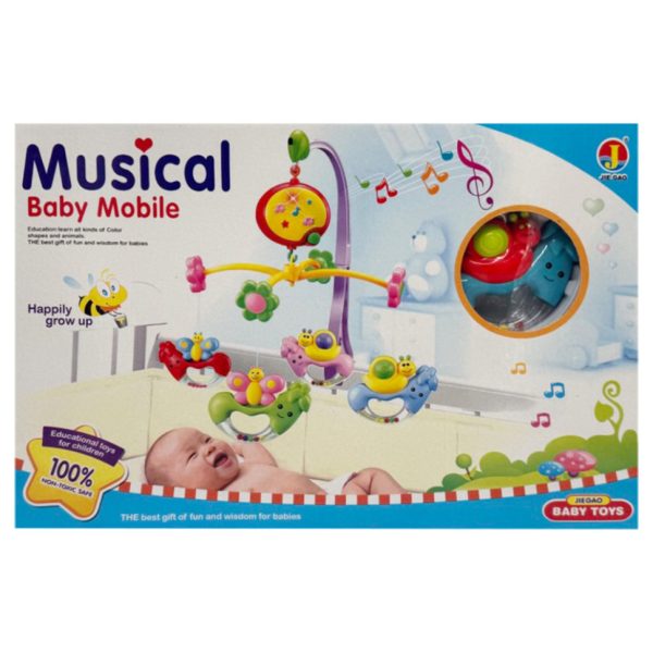 Мобіль складається з чотирьох іграшок, які кріпляться за допомогою мотузок і колишуться в повітрі. Карусель виконана в ніжних, не дратівливих кольорах, а завдяки музичному та світловому супроводу буде ще більше привертати увагу дитини.