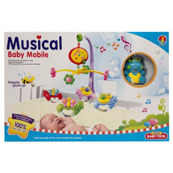 Мобіль складається з чотирьох іграшок, які кріпляться за допомогою мотузок і колишуться в повітрі. Карусель виконана в ніжних, не дратівливих кольорах, а завдяки музичному та світловому супроводу буде ще більше привертати увагу дитини.