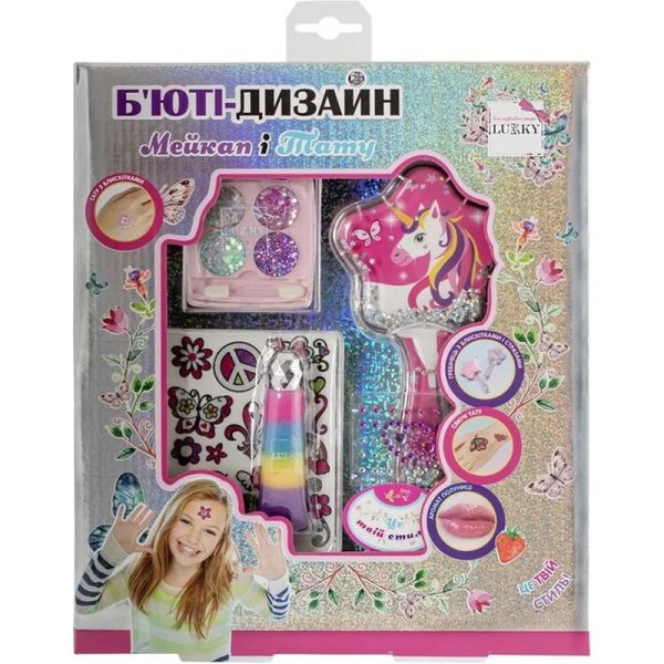 Набір косметики для дівчат “Мейкап і тату” марки “Lukky”. Набір складається: блиск для губ полуничне суфле – 1 шт тіні для повік з блискітками на гелевій основі палетка 4 кольори (перламутровий, блакитний, 2 відтінки фіолетового, з аплікатором) блискітки-наклейки – 1 лист тату з блискітками – 1 лист щітка для волосся – 1 шт Кожна дівчинка легко зможе створити свій неповторний образ з косметикою Lukky легко та весело!