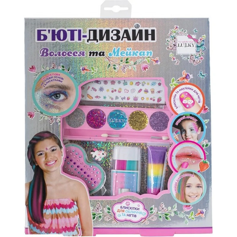 Набір косметики для дівчат “Волосся та мейкап” марки “Lukky”. Набір складається: блиск для губ Гранатовий десерт – 1 шт гелеві тіні з блискітками та аплікатором, палетка 5 кольорів (фіолетовий, блакитний, золотистий, темно-червоний, сріблястий) – 1 шт крейда-пудра для волосся, колір рожевий “фуксія” – 1 шт крейда-пудра для волосся, колір бірюзовий – 1 шт блискітки для нігтів – 1 лист стікери для нігтів – 1 лист пластикове кільце “Єдиноріг” – 1 шт Кожна дівчинка легко зможе створити свій неповторний образ з косметикою Lukky легко та весело!