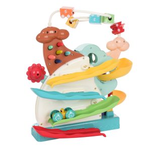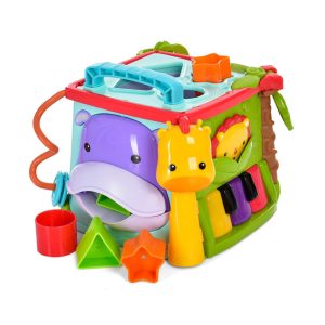 Іграшка оснащена розвиваючим сортером, музичним ручним барабаном з підсвічуванням та рухомими шестернями.