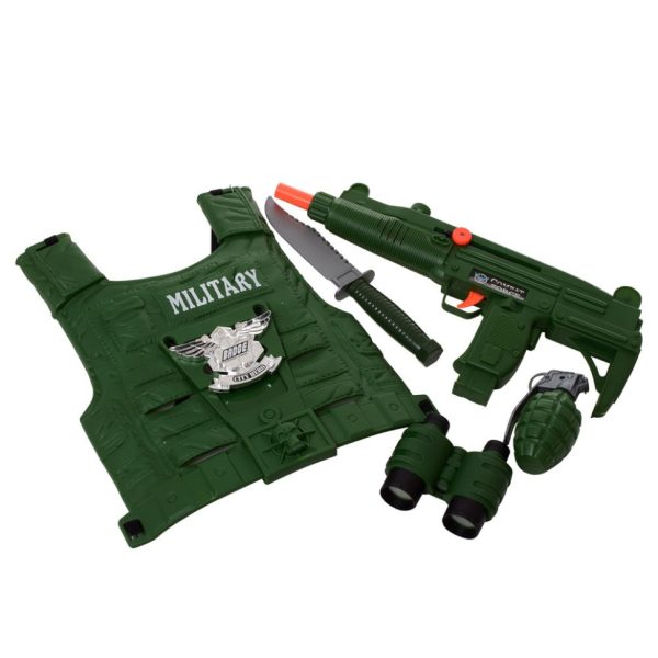 Дитячий ігровий набір військового – це набір, який містить у собі елементи, що імітують екіпіровку. До набору входять шолом, куртка, автомат узі, бінокль, ніж і бронежилет. Загалом, дитячі ігрові набори військового для розваги та гри, а також для допомоги дітям у професії військового та навчанні основ безпеки.