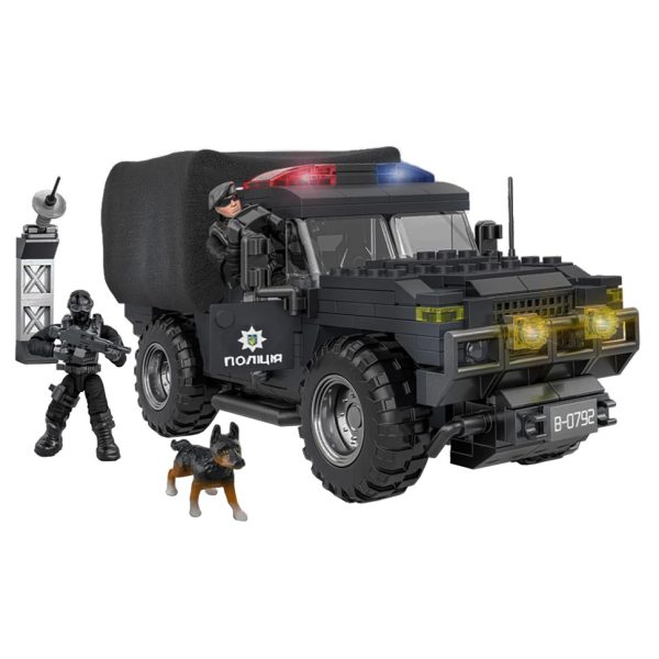 За допомогою цілого набору різноманітних спеціальних поліцейських засобів з цієї серії, Ваш малюк може зібрати не лише джип спецпризначенців, а й вантажівку, катер та іншу техніку.