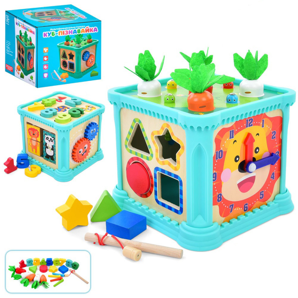 Наш ігровий куб — це універсальний навчальний і розвиваючий іграшка, яка подарує вашій дитині безліч веселих моментів! Розміром 17x17x15 см, куб оснащений різноманітними активностями, які допомагають розвивати моторику, логічне мислення та творчі навички. На одному з боків куба знаходиться сортер з різними формами, де діти можуть вчитися розпізнавати геометричні фігури. Інший бік містить шестерні, які цікаво обертати, вивчаючи основи механіки. Цифри на кубі допоможуть малюкам познайомитися з основами математики, а годинник — з поняттям часу. Куб також включає унікальну гру “Рибалка”, де дитина за допомогою магнітної вудки ловить “рибку” серед різноманітних овочів, таких як гусениці та морква, що перетворює навчання в цікаву гру на свіжому повітрі — в саду або городі. Ця іграшка стане чудовим доповненням до ігрових моментів вашої дитини, забезпечуючи її розвиток у захоплюючий та ігровий спосіб!