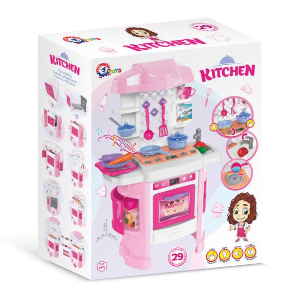 Комплектація: іграшкова кухня, варильна панель з електронним модулем, кран, дощечка, каструля з кришкою, сковорідка, чашка – 2шт., блюдце – 2шт., ложка – 2шт., вилка -2шт., ніж – 2шт., тарілка – 2шт. , цукорниця з кришкою, вилка велика, шумівка, лопатка, черпак, огірок, морква, баклажан, помідор, коробочка – 2шт., губка.