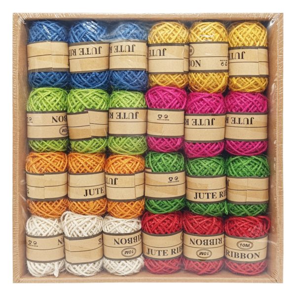 Нитки для творчості джутові різнокольорові використовуються для рукоділля, пакування сувенірів, декору предметів інтер’єру. Моток без втулки 10м, діаметр нитки 2 мм.