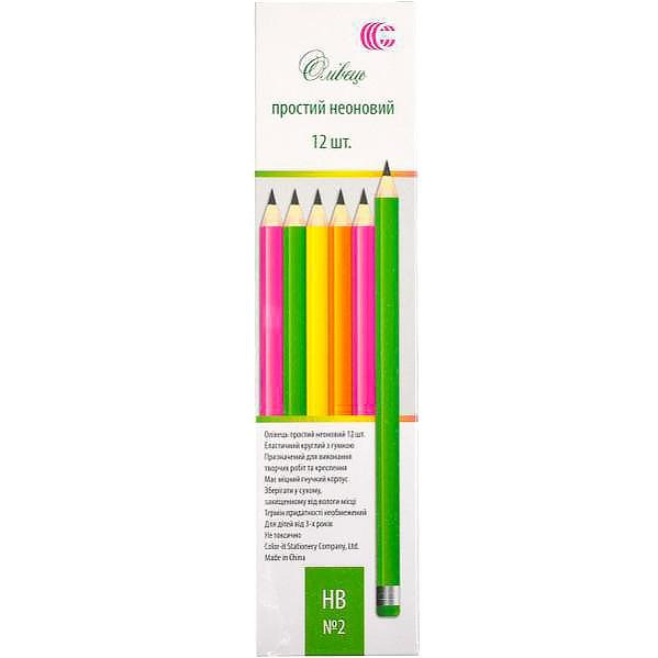 Олівець простий неоновий з гумкою. Чорнографітний, твердість НВ. Упаковка містить 12 олівців.