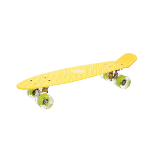 Пенні Борд. Легка дека зроблена з міцного формованого пластика. Довжина деки – 55 см., Ширина – 15 см. Принт завдано на деку з одного боку. Колеса PU, d = 6 см. Максимальне навантаження 70 кг. Колеса зі світлом