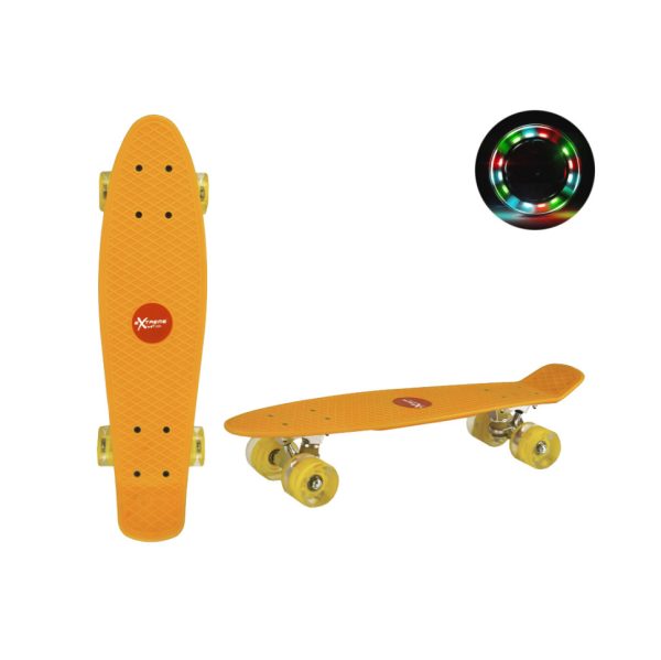 Пенні Борд. Легка дека зроблена з міцного формованого пластика. Довжина деки – 55 см., Ширина – 15 см. Принт завдано на деку з одного боку. Колеса PU, d = 6 см. Максимальне навантаження 70 кг. Колеса зі світлом
