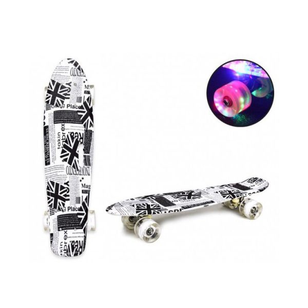 Пенні Борд. Легка дека зроблена з міцного формованого пластика. Довжина деки – 55 см., Ширина – 15 см. Принт завдано на деку з одного боку. Колеса PU, d = 6 см. Максимальне навантаження 70 кг. Колеса зі світлом