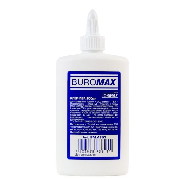 Зручний пластиковий флакон з дозатором, який викручується. Ковпачок-дозатор регулює подачу клею та запобігає його висиханню, дозволяє наносити клей краплями і тонкою лінією. У горизонтальному положенні флакона клей не випливає. Не токсичний, змивається водою.